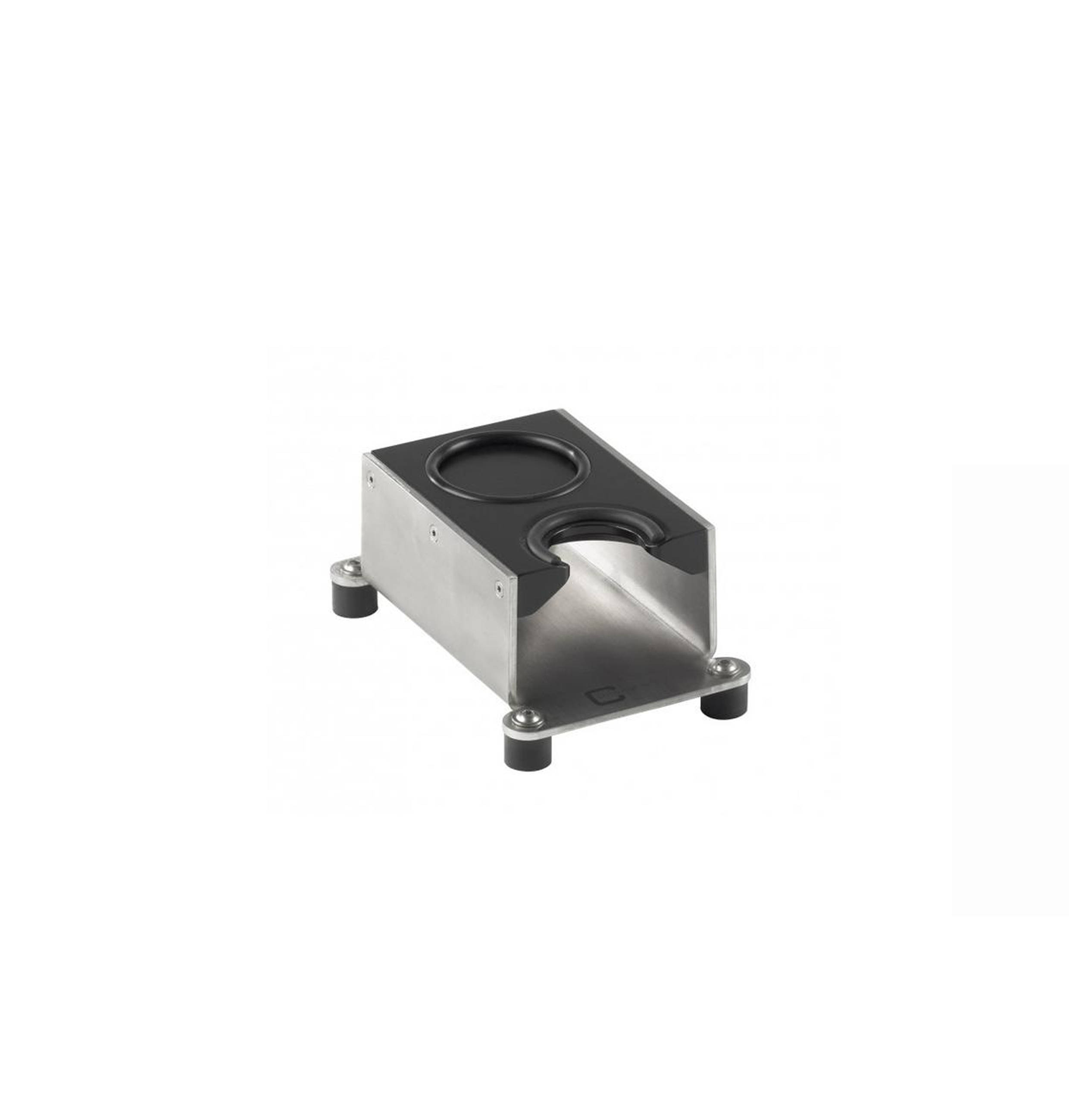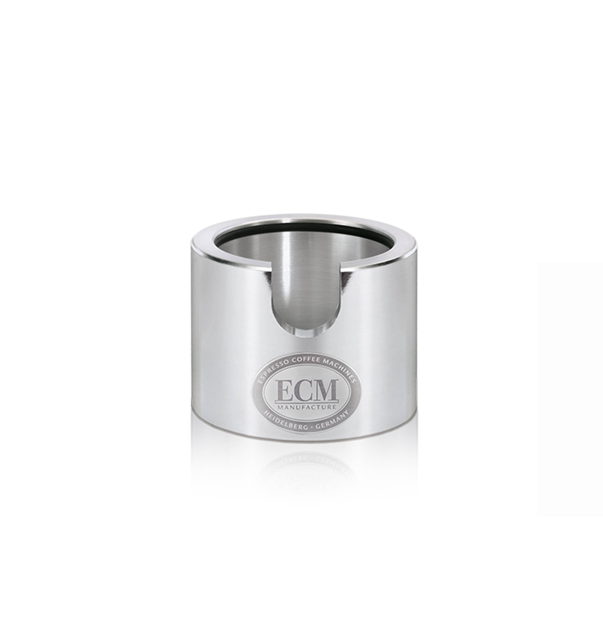 Tamperstation aus poliertem Aluminium, Boden auf einem Gummiring, die obere Innenwand hat einen Kunststoffring.
